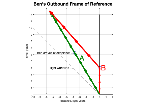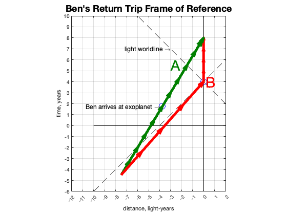 Traveling through space slows down your travel through time. And yet… we are left with the question of just why can’t we linearly add the separate inertial travel segments? And how do we interpret the timelines where Ben, in his return trip reference frame, appears to have left Earth years before he actually did?